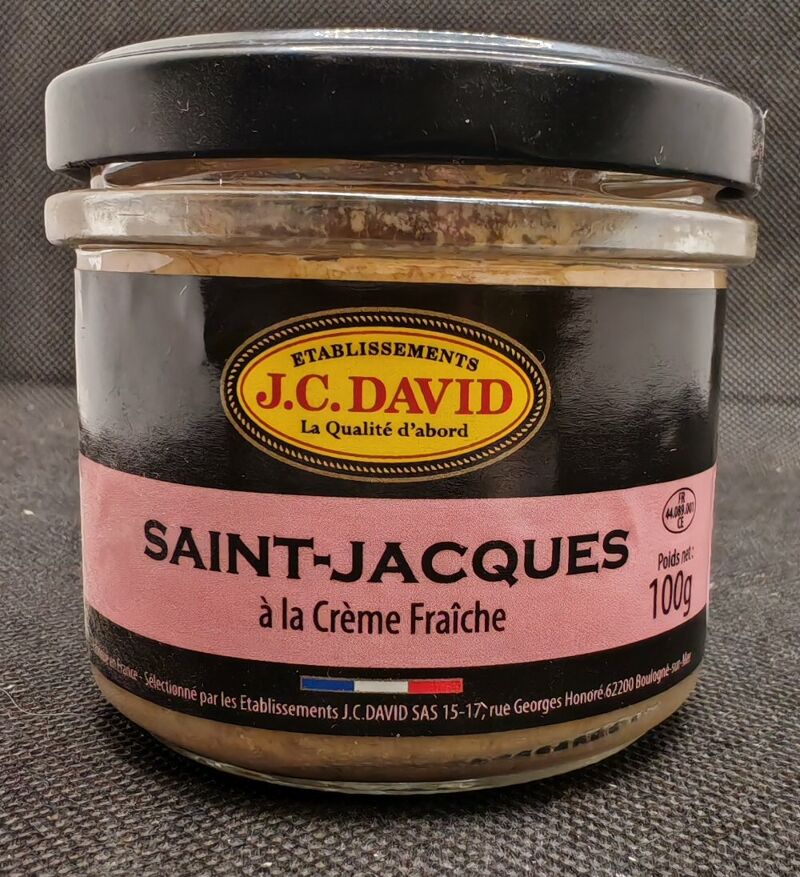 C’est une préparation tartinable à base de noix de Saint‑Jacques et de crème fraîche, créée et fabriquée artisanalement par la conserverie JC David (Ets J.C.D SAS).