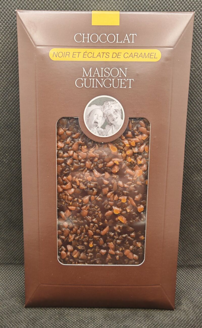 Savoureuse tablette de chocolat noir intense, sublimée par de fins éclats de caramel croquants pour une alliance parfaite entre amertume et gourmandise.