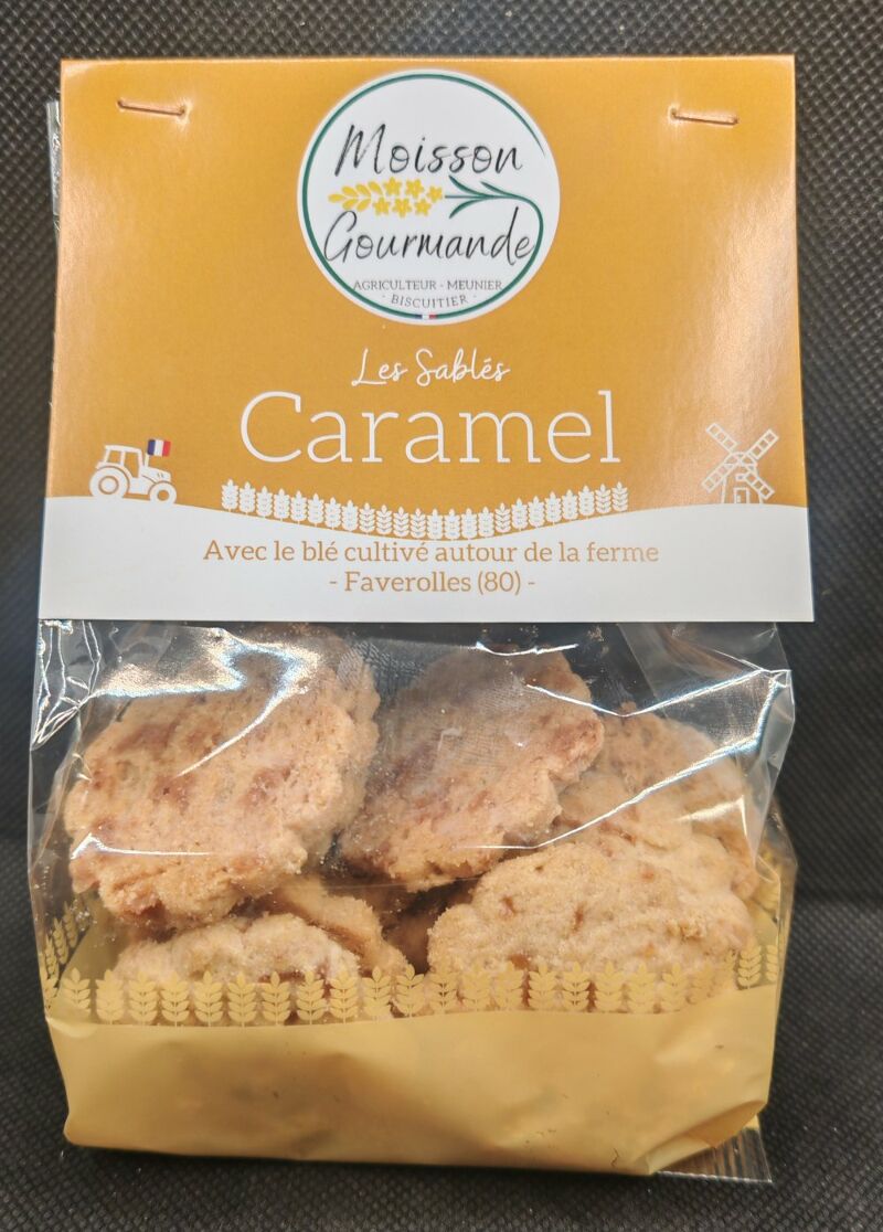 Délicieux sablés pur beurre fabriqués à la ferme avec le blé cultivé autour de Faverolles (80). Leur pâte croustillante et dorée est relevée par de fondants éclats de caramel au beurre salé. Une recette authentique, courte et locale, qui met en valeur les céréales de la ferme et le savoir-faire artisanal picard.
