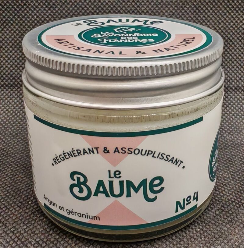 Le Baume n°4 de la Savonnerie des Flandres est un soin régénérant et assouplissant formulé avec huile d’argan et un parfum floral apporté par les huiles essentielles de géranium, niaouli et ylang‑ylang. 🌼 Il nourrit la peau en profondeur, s’utilise sur les lèvres, le visage, les mains et le corps et laisse une texture non grasse après application.